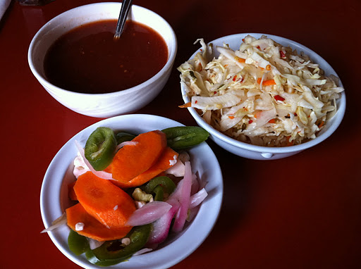 The pupusas are served with pickled vegetables and a traditional curtido. The pickled vegetables were scrumptious! The curtido consists of a lightly fermented cabbage slaw with chilis and vinegar, and a watery tomato salsa. I couldn’t help but drown my pupusas with the curtido, lol! No sense in wasting food!