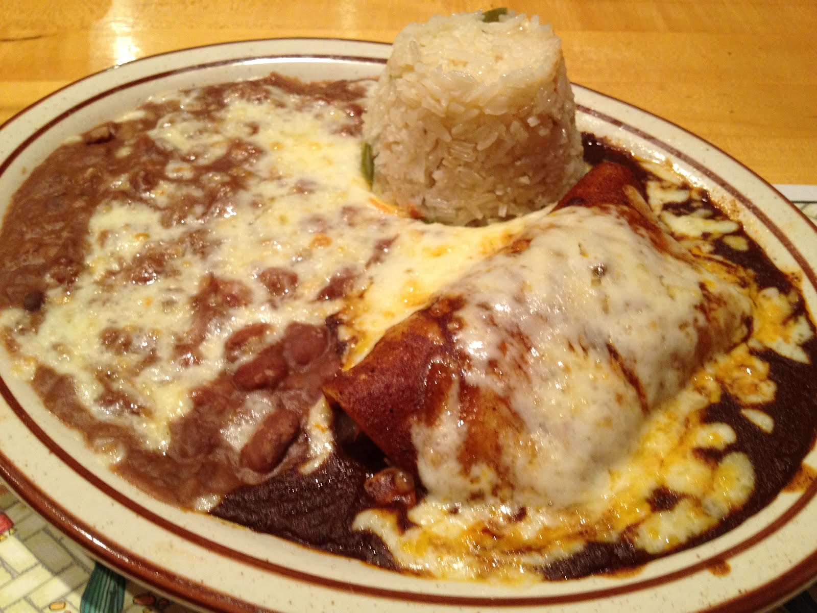 Now this was good! I loved the enchilada sauce. It was dark and rich and very mole tasting. The refried beans were also delicious as was the rice. I only order the single enchilada and I’m glad I did because you get a lot of food. It also came with a side salad and a corn tortilla. Add all you can eat chips and salsa and you’ve got a filling meal! Noms!