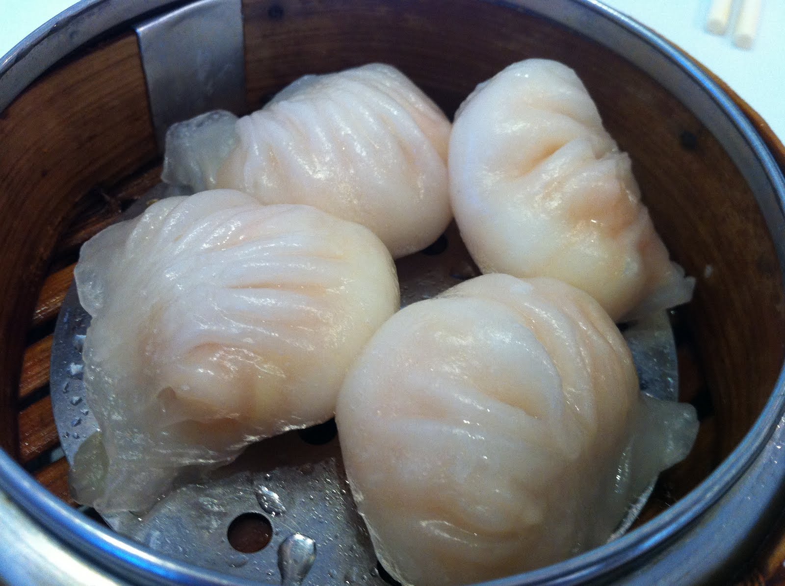 Steamed shrimp dumplings wrapped in a translucent wheat and tapioca starch wrapper.