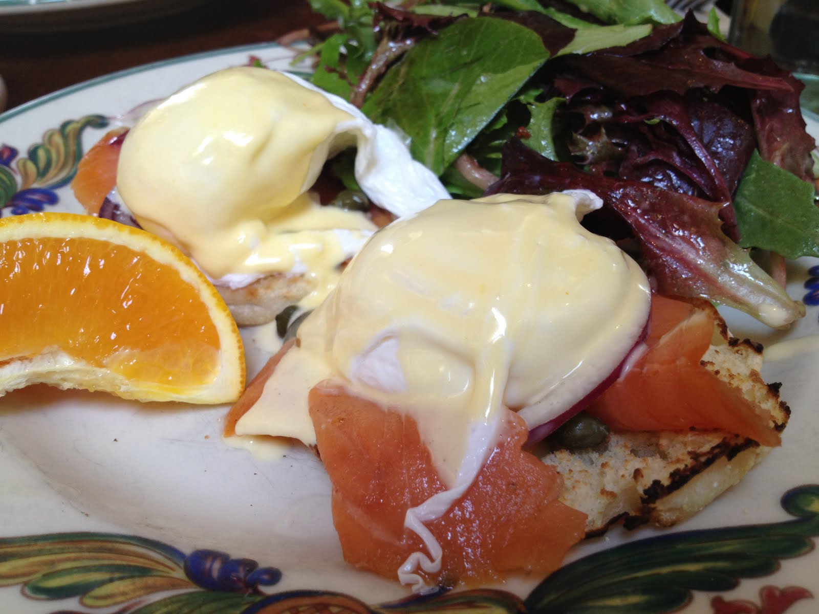 With bacon, grated white cheddar, and homemade salsa fresca. Served on an English muffin with a fabulous light lemon hollandaise, home fries and orange wedge. Two for $12
