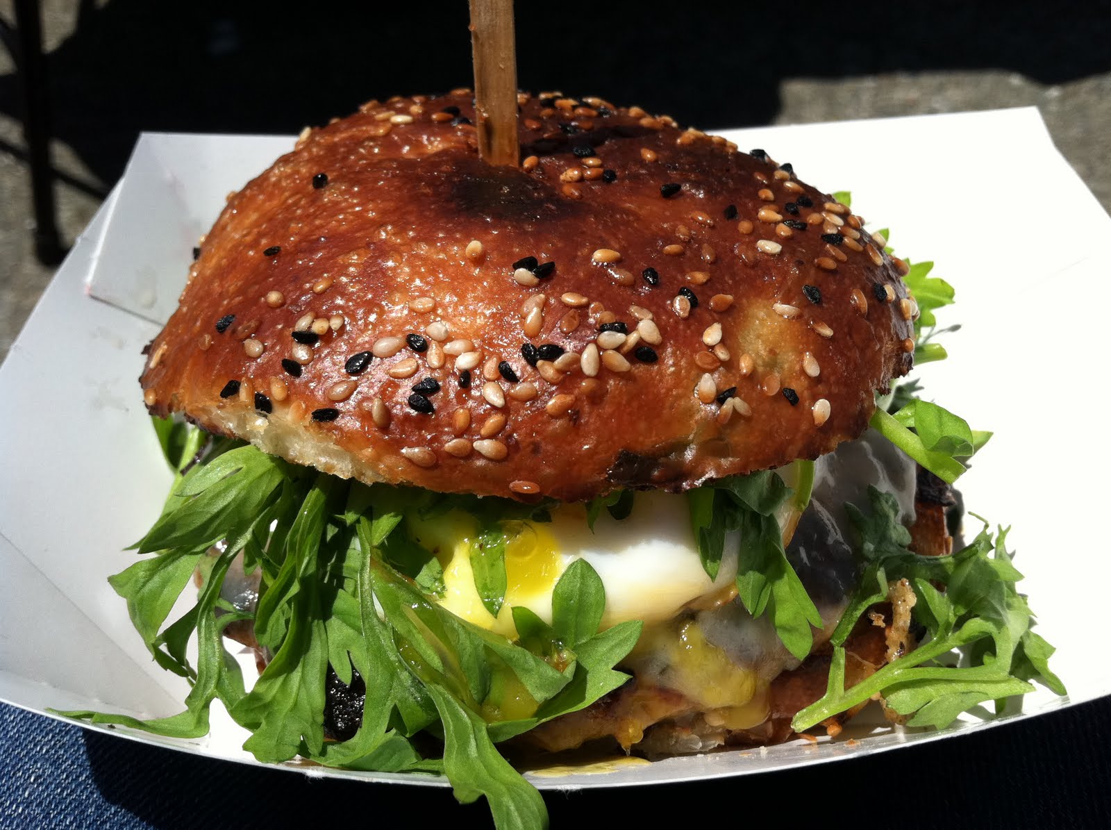 Bacon maple sausage, gruyere, over easy egg, pepper cress on toasted sesame brioche.