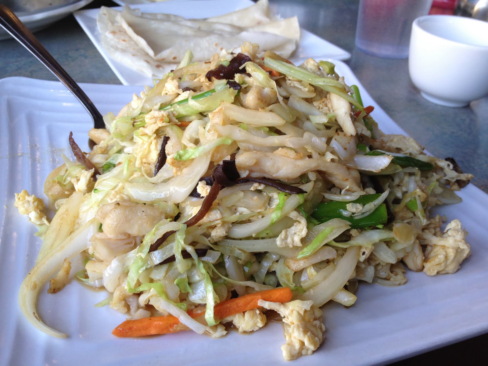 Large pile of shredded chicken, napa cabbage, onions, carrots, green onions, black fungus, and scrambled eggs.  Served with mu shu pancakes.  These are always fun to eat because you get to make yummy Chinese burritos of sorts.  The hoisin (or plum sauce) tastes great with the mildly flavored filling. $7.95