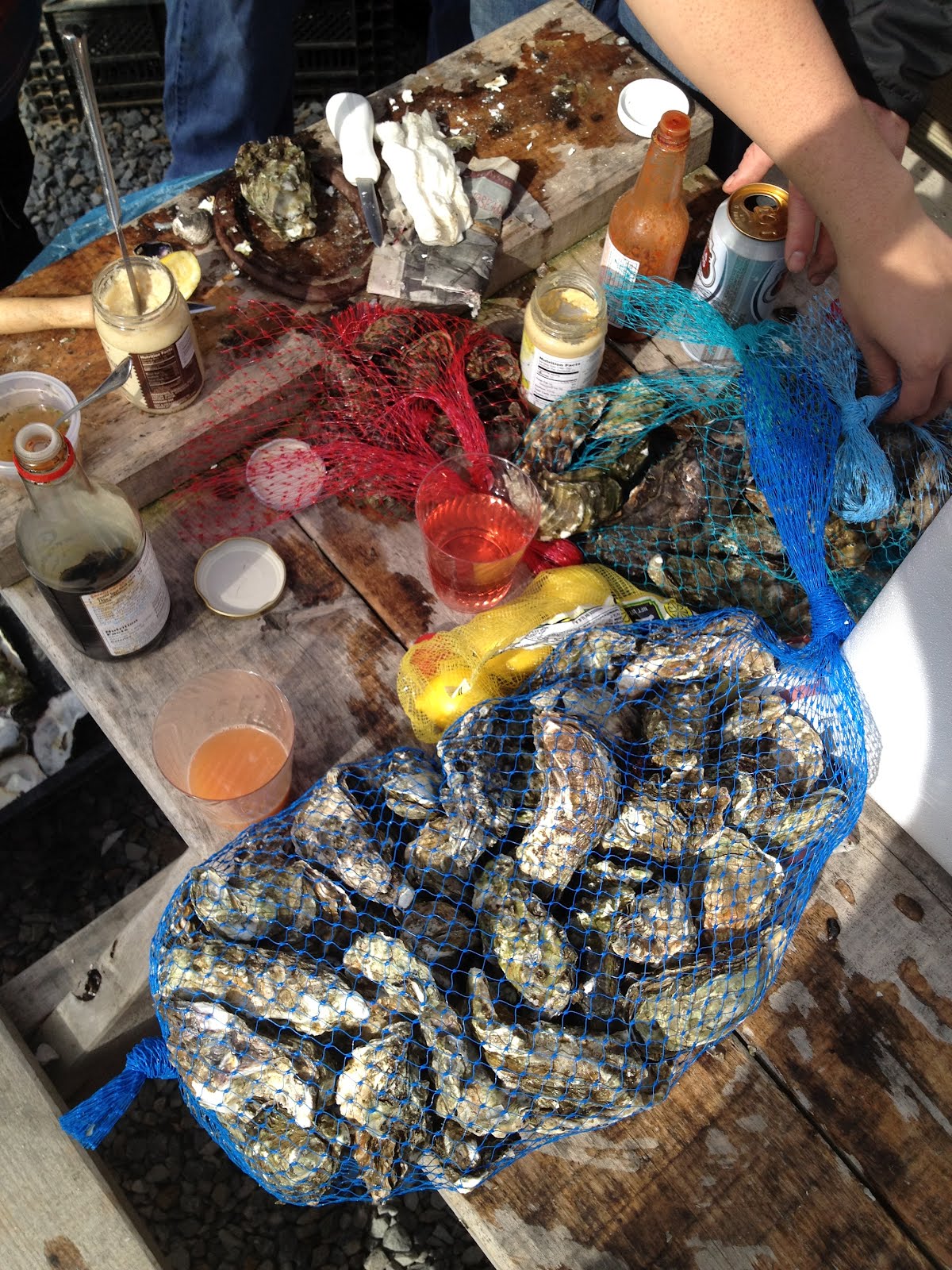 Our table became quickly covered with oysters, clams, condiments and drinks.