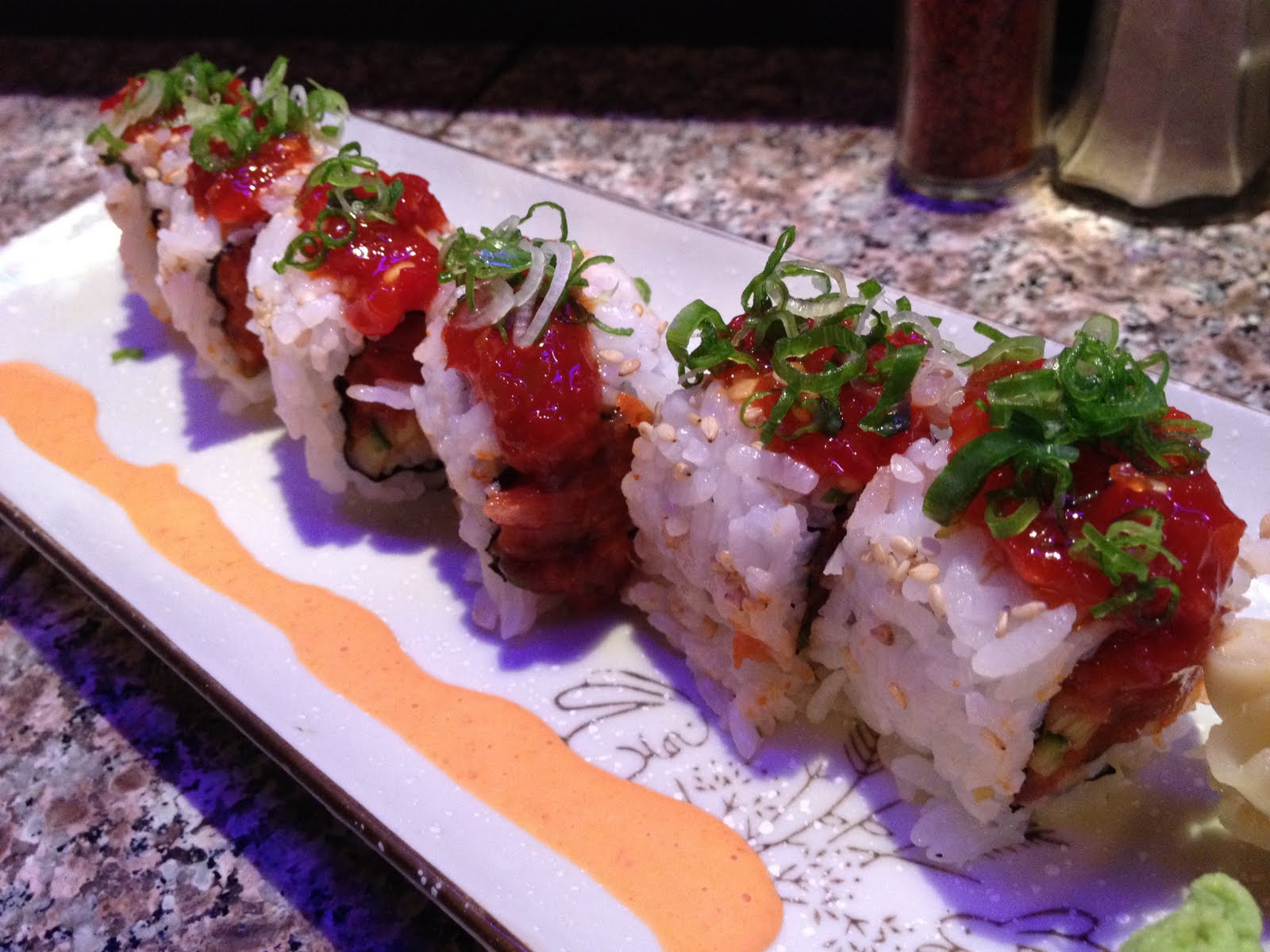 The spicy tuna roll ($6 happy hour) is huge! Awesome, right? Wrong! No one wants to eat more of a crappy roll. There was enough rice on this thing to feed a small Japanese prefecture! And the tuna wasn’t spicy at all, but it was mutilated to the consistency of Whiskas cat food.